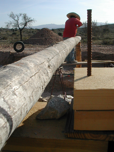 24 & 26 Jan 08Beams, glorious beamsNo sooner had the cement set and we were back putting up the first column, which meant that the main centre beam could be put up - all 6 metres of it -, which meant that the second column could be cut, which meant..... we ran out of light! Don't worry, well be back at the weekend.