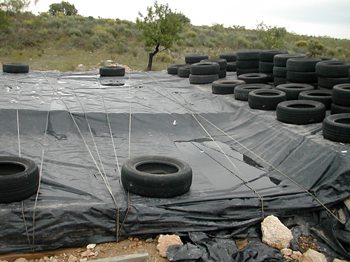 GuttersTalking of rain, it's the first time Dave has been at the Earthship when it's been pouring down, so he got to see where the water was coming in and made makeshift gutters to redirect it - they filled every container we had with rainwater.