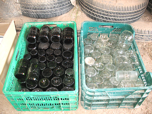Another idea for the entranceAfter putting the two fancy anis bottles into the bathroom wall a few weeks ago it gave me an idea for the bit above the door in the entrance. I've found 7 different bottles with lovely shapes and/or moulded glass which I think might look nice as a sunburst. What do you think?